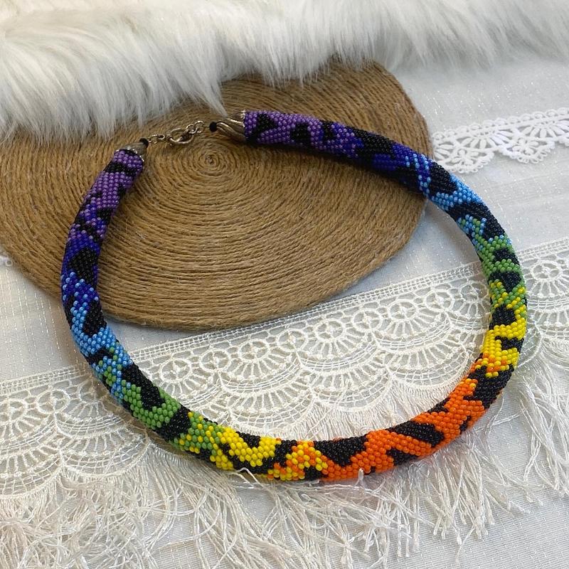 Яркий жгут кольер носит из чешского бисера, принтованный радужным леопардом – это современное сочетание трендов и классики Это украшение отлично сочетается с открытыми сучками, блузками, рубашками и свитерами. Отлично дополнит практически любой стиль образа