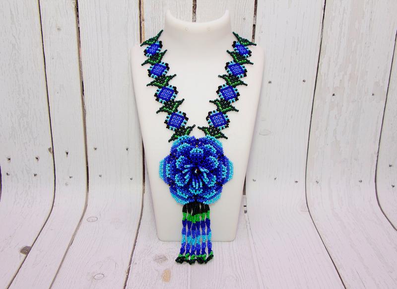 Колье Герань синее – колье ручной работы выполнено из чешского бисера плете на вискозной прочной нитке без замочка (внутреннее отверстие 60 см), размер цветка – 7 см. Возможно выполнение данного колье в других цветах. Длина - 41 см. Ширина – 2,5 см. Вага – 50 г.