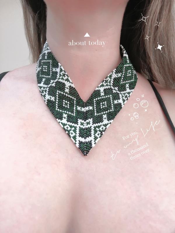 Очень изысканный угловой гердан. Сочетает в себе изумрудный, черный и белый цвета, которые сплетены в прекрасный узор. Завязки - кисточки серебряно - черного цвета. Гердан сплетен в технике ручного ткачества, а не на станку. Благодаря этой технике работа выходит значительно прочнее, строки ровными, бисер не гуляет вверх вниз. Данное изделие прослужит обладательнице много лет. Если даже разрезать такой гердан ножницами, он не рассыпается, так же легко можно пришить отрезанную часть назад. Да, данная техника занимает гораздо больше времени, чем плетение на станку, но качество изделия того стоит 🖤 Видеопросмотр этой работы можно посмотреть в инста ***************