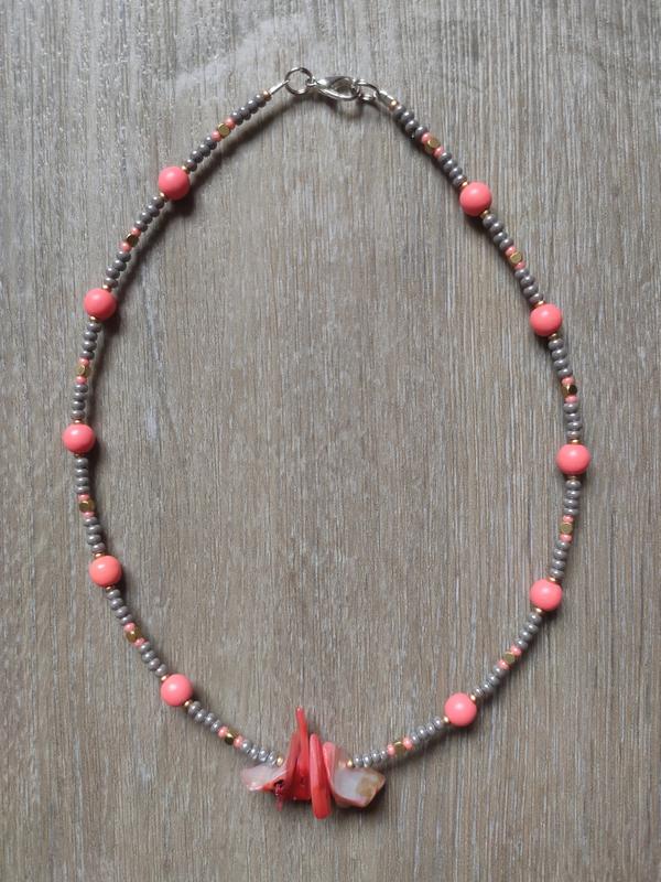 Продам яскравий, цікавий чокер із намистин натурального коралу, пластин натурального тонованого перламутру, чеського бісеру та латунних намистин. Нанизаний на ювелірний тросик, застібка – карабін. Розмір намистин коралу - 6 мм, центральних намистин перламутру - близько 15 мм. Довжина - 39 см, можна збільшити розмір за допомогою подовжувального ланцюжка на Ваше прохання або змінити розмір самого прикраси. З усіх питань пишіть - відповім.
