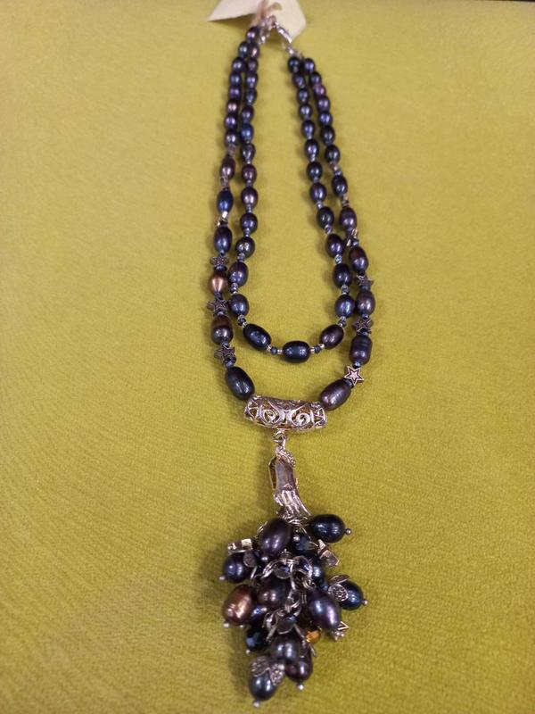 Намисто з натурального річкового чорного перлів (синій відтінок). Підвіс як пензлик руки, що тримає перлове гроно. Використалася якісна металева фурнітура.