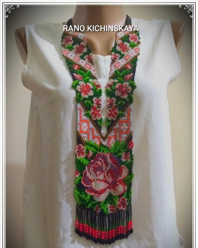 Нежная и яркая роза пахнет на холсте из черного бисера, он как лучше подчеркивает всю ее роскошность. Классическая цветовая палитра дает возможность носить его не только с разными образами, но и заменить вышиванку. Длину - 59 см Ширину - 10 см При заказе вы получаете свое украшение в подарочной упаковке! 🥰🌹💙💛🇺🇦