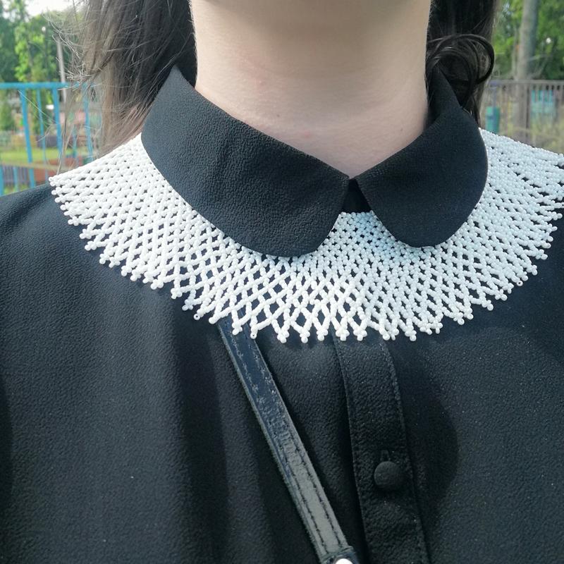 Белая широкая кривая, выполненная из китайского бисера, но это ей не мешает быть прекрасной. Выглядит шикарно, а цена значительно меньше обычной. Длина сверху 35 см, ширина 6 см, длина завязок по 18 см