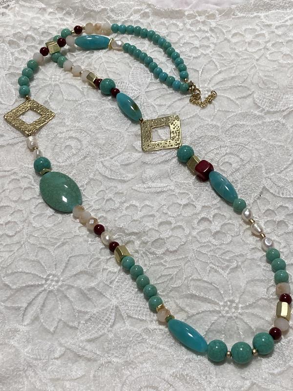 Ожерелье в золотом тоне под бирюзу бусины металл,пластик ,стекло и натуральный жемчуг.Длина 208+6см