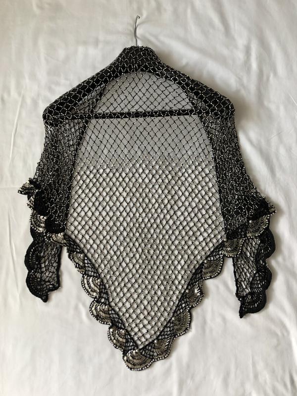 Косинка. Кроше, бисер. Ручная работа. Угольно черная основа кроше, бисер серебряный. Очень красиво драпируется, тяжелая. Потрясающе смотрится на плечах, на голове, на талии Восстанавливающее фото на подоконнике. РАЗМЕР: около высота посередине -60 см Длина по гипотентузе -112 см Очень пластичная. Стан идеален, дефекты отсутствуют.