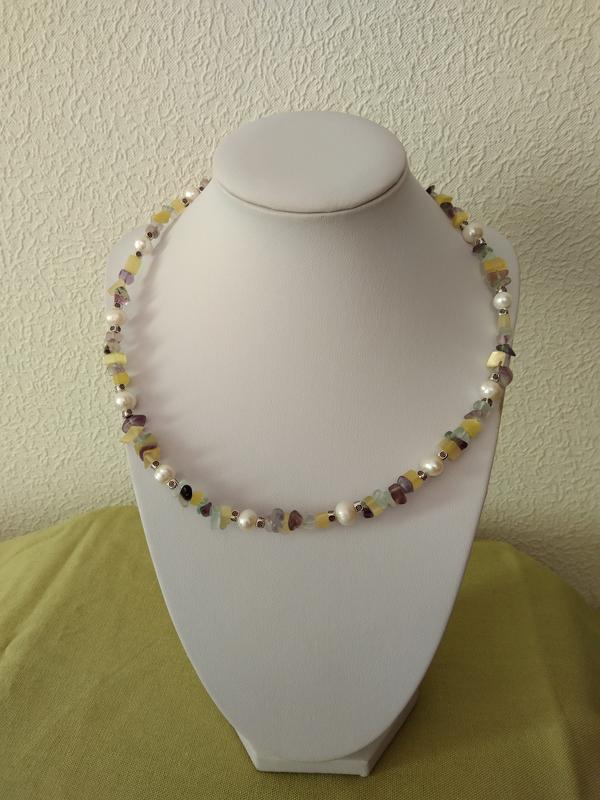 Коле-чокер из флюорита, кошачьего глаза, натуральных жемчужин. Длина 48 см.