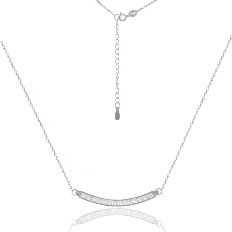 Жіноче кольє з доріжкою, посипаною фіанітами. Прикраса виконано з срібла 925 проби, покрита родієм. Родированное срібло не вимагає особливого догляду. Виділяється благородним рівним і чистим характерним срібним кольором і живим блиском.
