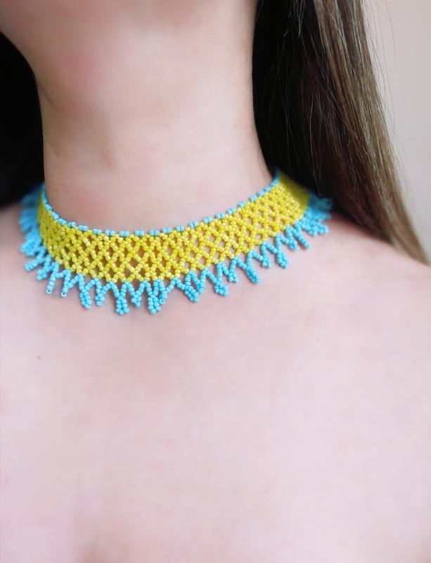 Патриотическая силка в желто-голубых цветах. Выполнена из китайского бисера. Завязки с кисточками желто-голубые