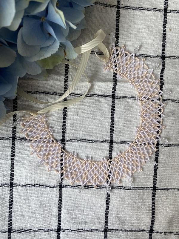 Крепится к репсовой ленте, сзади завязывается на бантик, ленты достаточно длинные, поэтому размер универсальный
