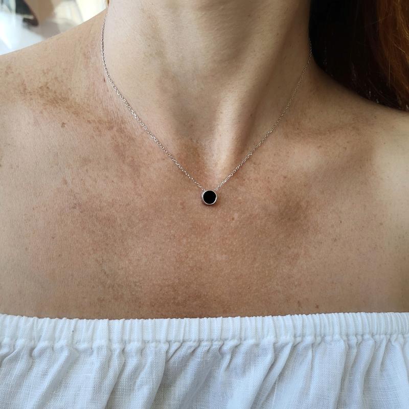 Колье Круг Серебро 925 пробы Родированное серебро Вес 1.80г Вставка камешек Оникс Черного цвета Диаметр круга 6 мм размер регулируется шариком до 43см Производство Украина На Всех ювелирных изделиях стоит проба палаты Украины подтверждающая материал изделия- и законность их реализации на территории Украины и именник производителя, который гарантирует соответствие ювелирных изделий требованиям ГСТУ 3527-97 "Изделия ювелирные из драгоценных материалов