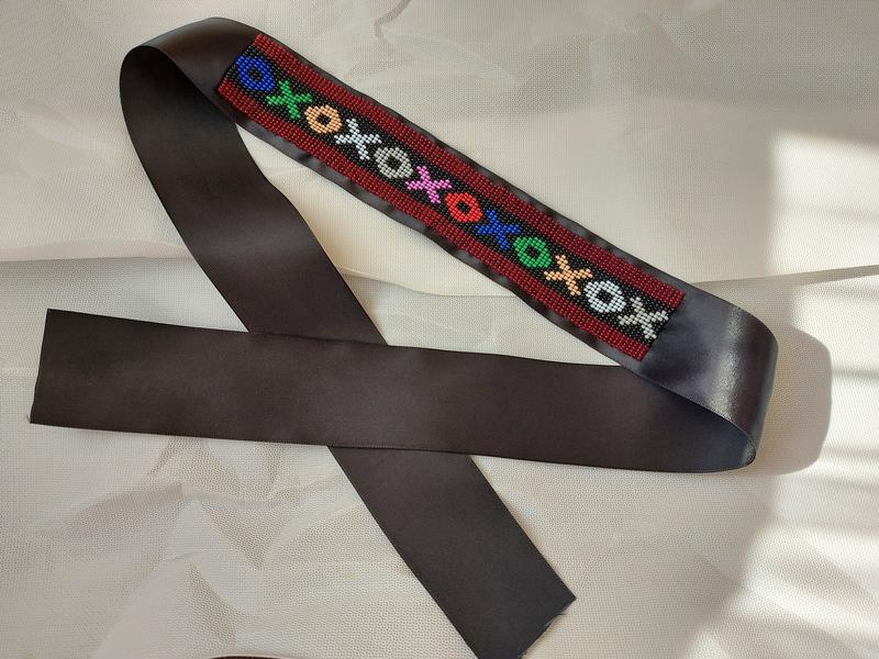 Ленточный гердан выполнен вручную из чешского бисера. Длина ленты 1м (есть возможность регулировать), длина бисерного полотна 26 см, ширина ленты 5 см. Вес готового изделия 33 г. Преимущество гердана на ленте в том, что можно использовать его как украшение на шею, или же на голову. Образ – фрагмент из гуцульской женской рубашки, музей Гончара.