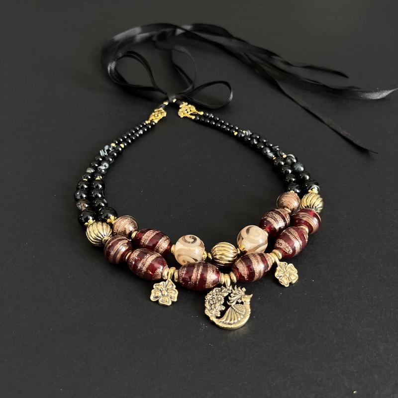 Ожерелье украшено автрским кулоном «Чудо птицы». Современная венецечка (стеклянные бусины с ручной росписью), латунное динь, агат, латунная фурнитура.
