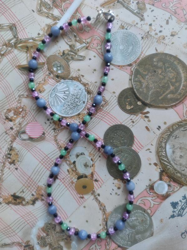 Продам яскравий, але водночас ніжний чокер з намистин натурального сіро-синього агату, нефриту, чорної шпинелі та муранського скла. Нанизаний на ювелірний тросик, застібка – карабін. Розмір намистин агату - 6 мм, нефриту - 4 мм, чорної шпинелі - 3 мм, муранського скла - 4 мм відповідно. Довжина - 41 см, можна поставити подовжувальний ланцюжок на Ваше прохання або змінити розмір прикраси. З усіх питань пишіть в особисті повідомлення - відповім.