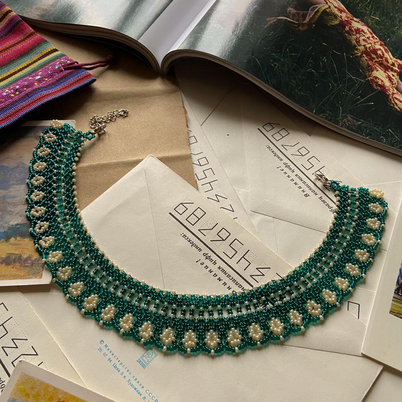 Изысканная силика из прозрачного бисера темно-зеленого и молочного цветов, длина 30 см, цепочка-удлинитель 4 см, ширина 3 см.