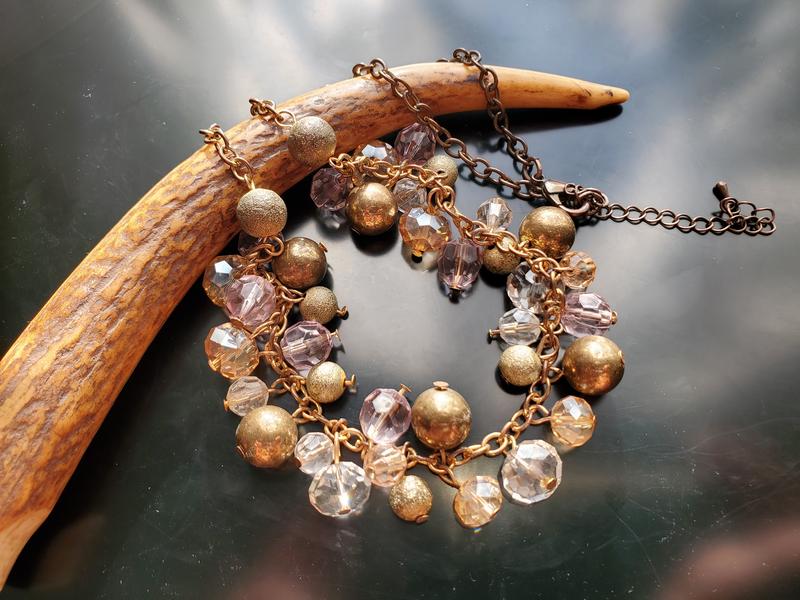 Роскошное колье из Америки, тяжелое, качественное, производитель неведомый, общая длина 50см плюс 7 удлинитель, на цепочке бусины 4 типов, хрустальные от Сваровски шампань с покрытием Аврора Бореалис, пластиковые ( имеют поверхностные микро-трещинки от времени), пластиковые золотистые и металлические под латунь, в реале невероятно красиво- Праздник- Праздник! Красивое Праздничное ожерелье на подарок.