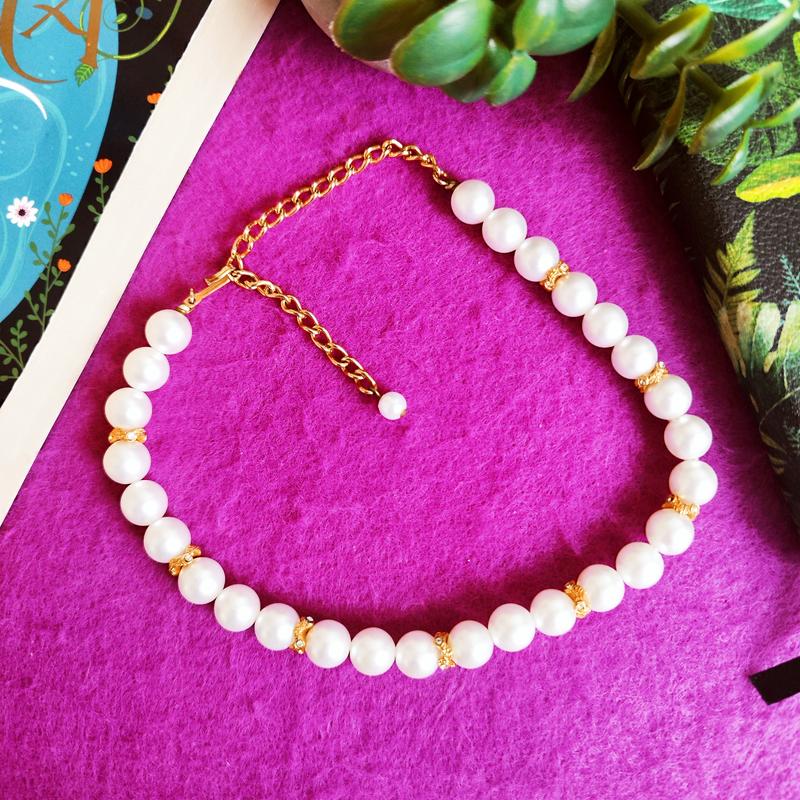 Кольє без маркування, 70-80-і роки. Прикраса н гачку, намистини одного розміру під перли чергуються з декоративними коннекторами з кристаликами. Фурнітура золотиста. Стан дуже добрий (є мікро подряпинка на гучку). Довжина - 39 см.