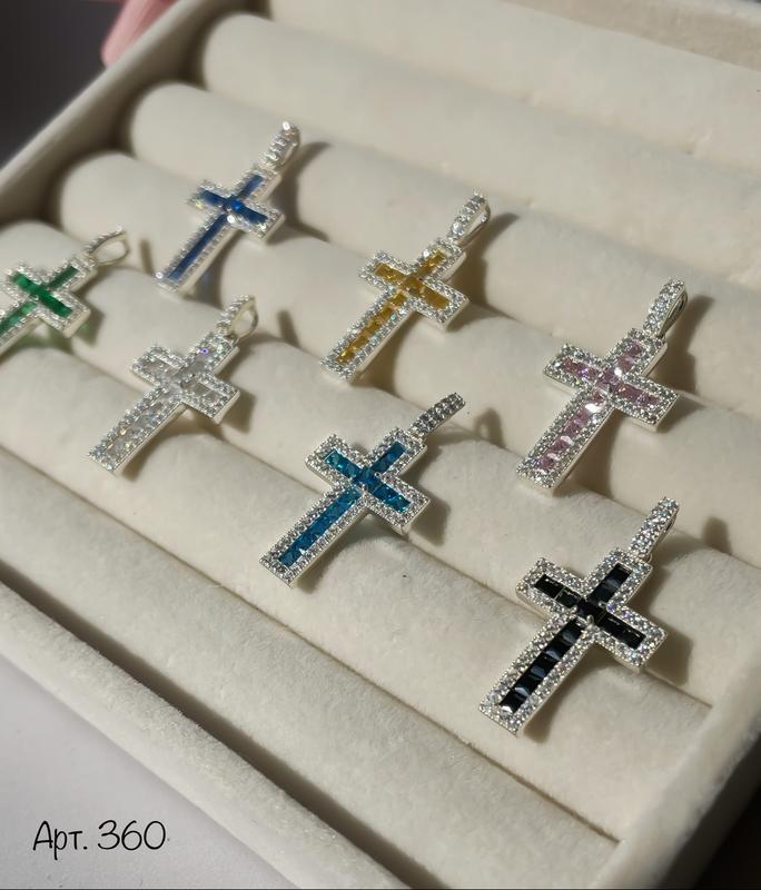 цена в объявлении указана по подвесу возможно покрытие родием, позолотой Арт. 360 (без цепочки) Арт. 361 (с цепочкой 40+5 см) • серебро 925 проба •вставки фианиты • средний вес крестика 1.83 грамма • средний вес с цепочкой 3,87 грамма • размер крестика 23*16 мм (с бунтиком 30*16 мм) • есть наляжка с подпиской Доступный в цветах: • белый • желтый • зеленый • розовый • голубой • синий • черный Арт. 360 цена - 1060 грн Арт.360/1 Цена-1385грн
