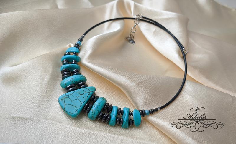 гематит та пресована бірюза. Прекрасну зібрано на основу з пам'яттю, довжина -43 см+ 5см ланцюжок -подовжувач.
