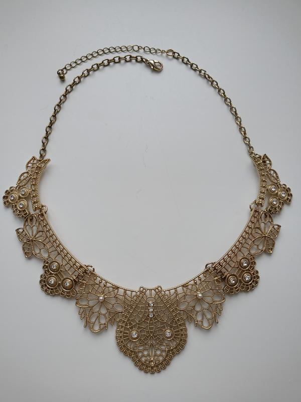 Оригинальное колье из ажурного металла. Не хватает самого нижнего камушка.