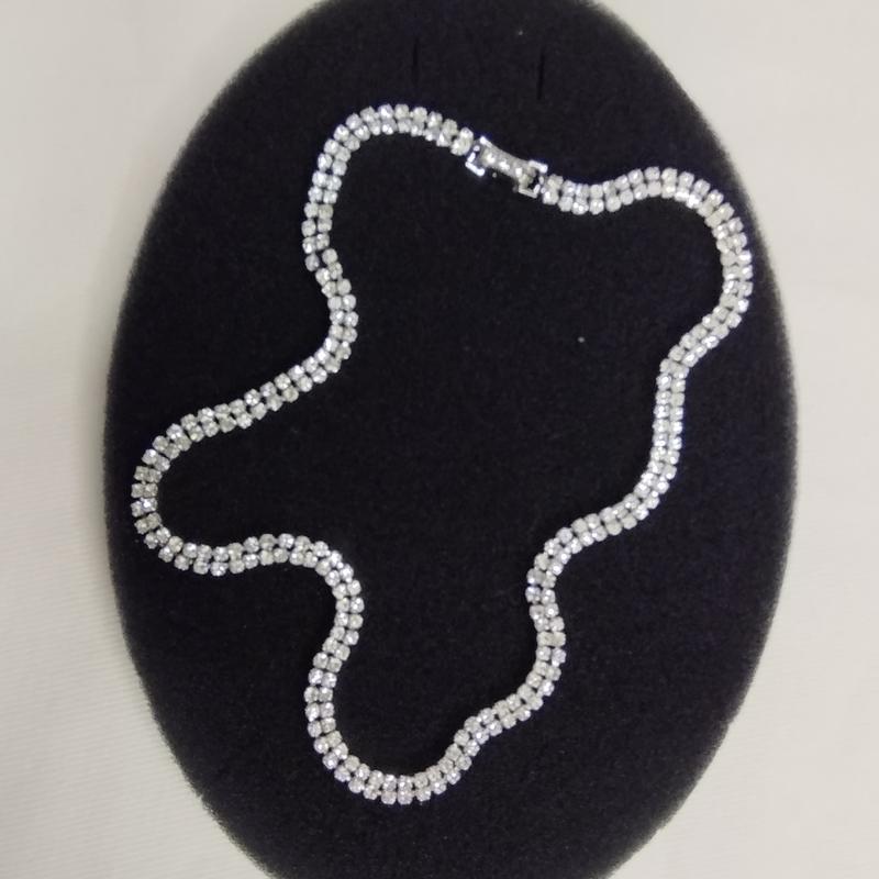 Очень красивое изысканное колье со стразами в серебристом металле. Камера не передает, но камушки имеют яркий бриллиантовый блеск. Состояние отличное, маркировка отсутствует. Длина колье 40 см. ширина -0,5 см.