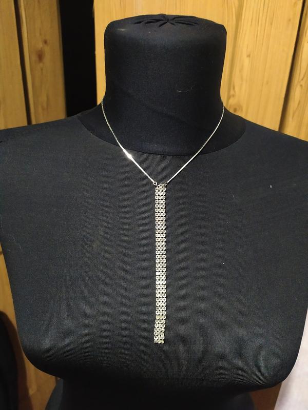 Длинная подвеска 13,5 см, вся в камушками.Тоненький серебристый цепочек 36 см.Очень красиво сверкает