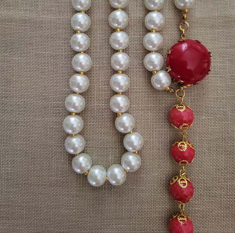 ольет выполнено мной из стеклянных жемчужин, застежка винтажная коробочка с стеклянным кабоном. Красные бусины - нефрит. Колье украшено искусственной винтажной бусиной в барочном стиле. Длина колье 120см, то есть, если надеть, оно свисает на 60см!! Фото инстаграм обрезает. В полную длину скина в мессенджер. Вариантов, как их надевать множество. Одна примечание - если Вы надевите его в полную длину, то застежка-бусина иногда возвращается, потому что оно тяжелое для нее. В любом другом варианте все лежит красиво. Вещь просто невероятной красоты. незамеченной не останетесь.