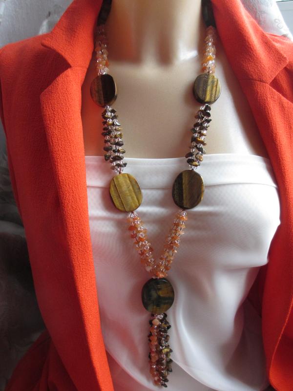 Шикарное брендовое колье сотуар PER UNA от M&S с крупными камнями тигрового глаза, с нитями других натуральных камней, с подвеской с кистью. Камни великолепные, с прекрасным рисунком. Украшение заметное и богатое. Длина 74 см, плюс удлинительная цепочка. Подвеска 14 см. Камни 40х32х8 мм. Вес 181 г. Возврат не предусмотрен. Наличие уточняйте предварительно. Не забудьте просмотреть "Все товары продавца" и найдете еще много интересного.