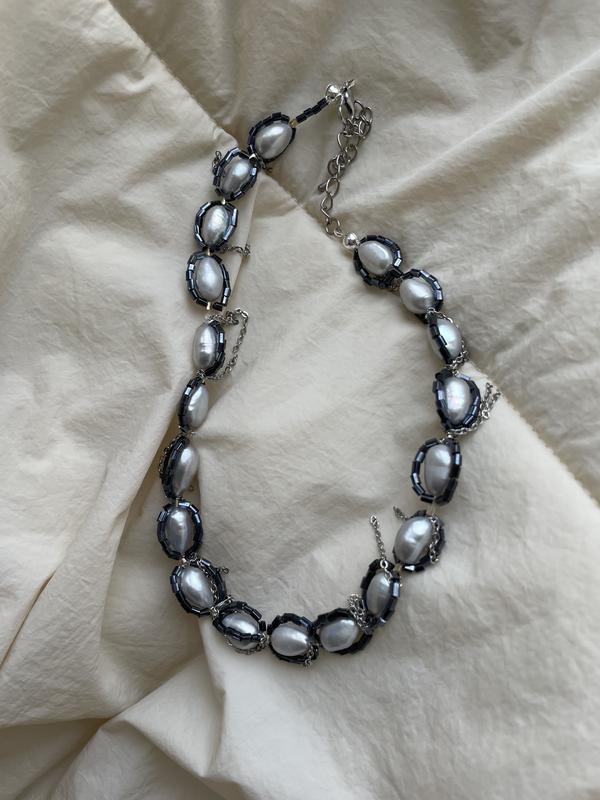Колье можно носить как и чокер. Из натуральных жемчужин серого цвета и бисера, с цепочками.