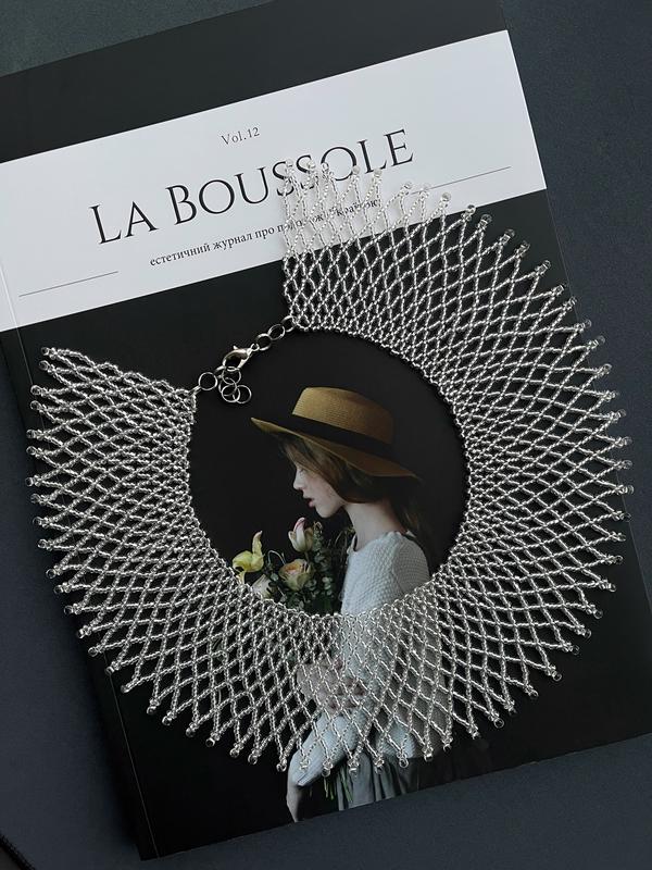 З чеського бісеру і японських намистин. Ширина близько 6 см. Довжина бісерної частини по меншому діаметру 35см+ застібка 7 см