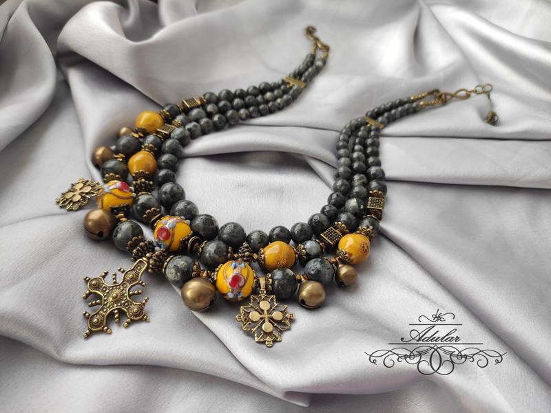 ,Лабрадорит, стекляные бусины ручной работы , керамические бусины с глазурью и фурнитура бронзового цвета. Згарды - авторське литво.