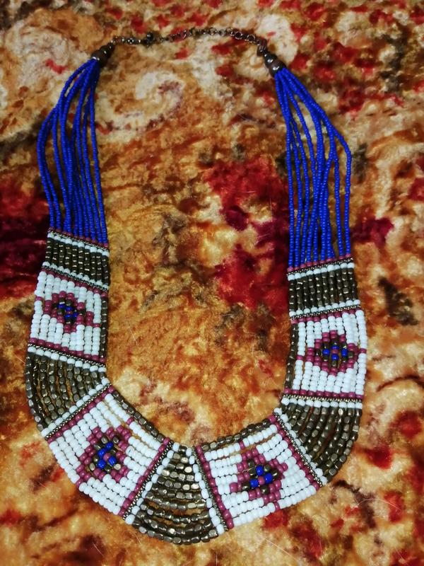 Це чудове бісерне намисто ручної роботи комбінує синій, червоний, білий та золотий барви!
