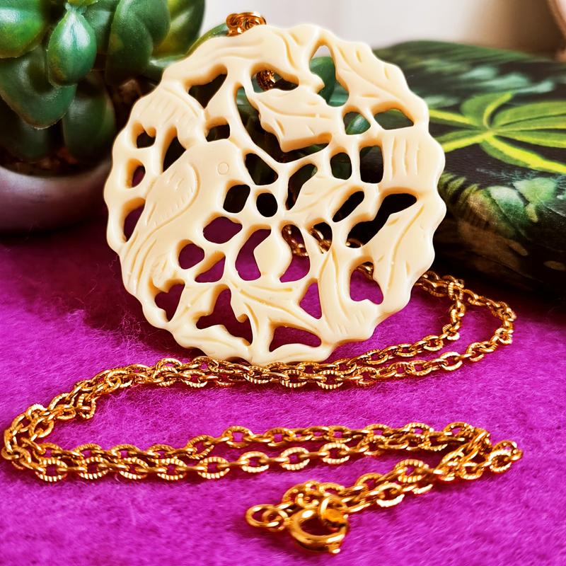 Колье с крупной круглой подвеской - имитация слоновой кости. 70-80-е годы. Идеальное состояние! Резьбовой узор с птицей и растительными мотивами. Цепь ярко-золотистая. Брашированные звена. Застежка - шпрингель. Диаметр кулона - 5,5 см. Длина цепи - 61 см. Без маркировки. Добавлен видеообзор.