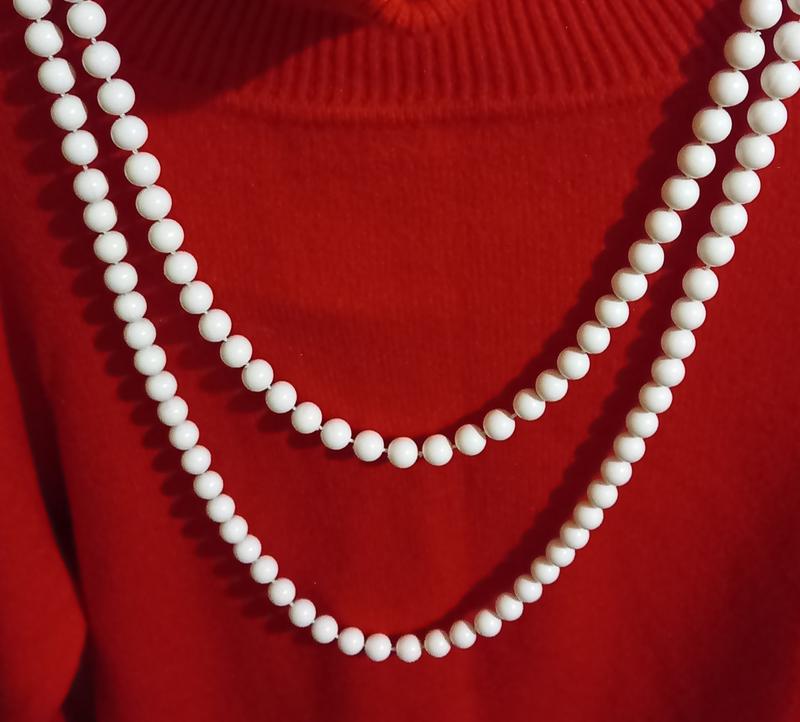 Класичне, біле намисто із якісного пластику( нанизане через вузлики, пластик не фарбований- суцільний). Дуже гарне і якісне намисто, елегантне. Двовге- можна носити в дві і три низки. Стан- ідеальний. Довжина- 140 см. Американський вінтаж.