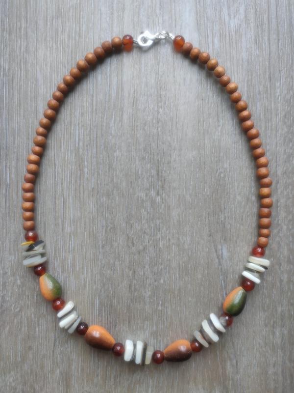 Продам цікавий, автентичний чокер з намистин коричневого агату, пластинок перламутру, а також керамічних та дерев'яних намистин ручної роботи, унісекс. Чокер нанизаний на ювелірний тросик, застібка – карабін. Виконаний в єдиному екземплярі! Розмір намистин агата - 6 мм, намистин з дерева - 5 мм, керамічних намистин - 10×20 мм. Довжина чокера із застібкою - 44 см, можна додати подовжувальний ланцюжок на Ваше прохання або змінити розмір самої прикраси. З усіх питань пишіть - відповім.