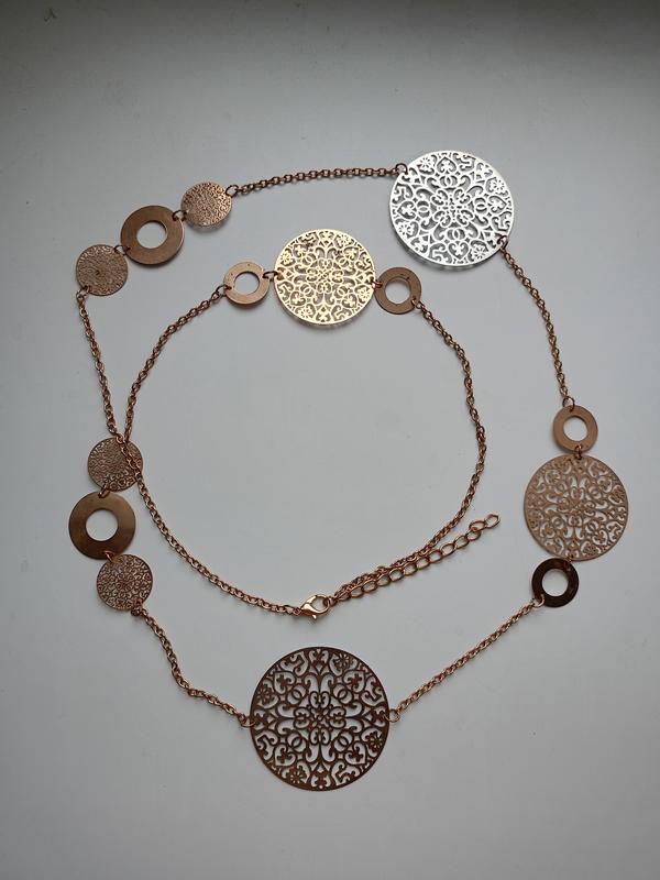 Красивое, воздушное ожерелье из двухцветного металла. Можно носить в один или два ряда, длина позволяет. Металлические диски тонкие, но крепкие, ожерелье не тяжёлое. Полная длина: 117 см.