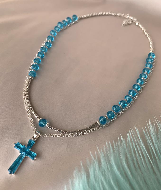 Невероятное колье с голубыми кристаллами, серебряной цепочкой и подвеской крестиком. Длина колье 38 см, можно добавить удлинитель.