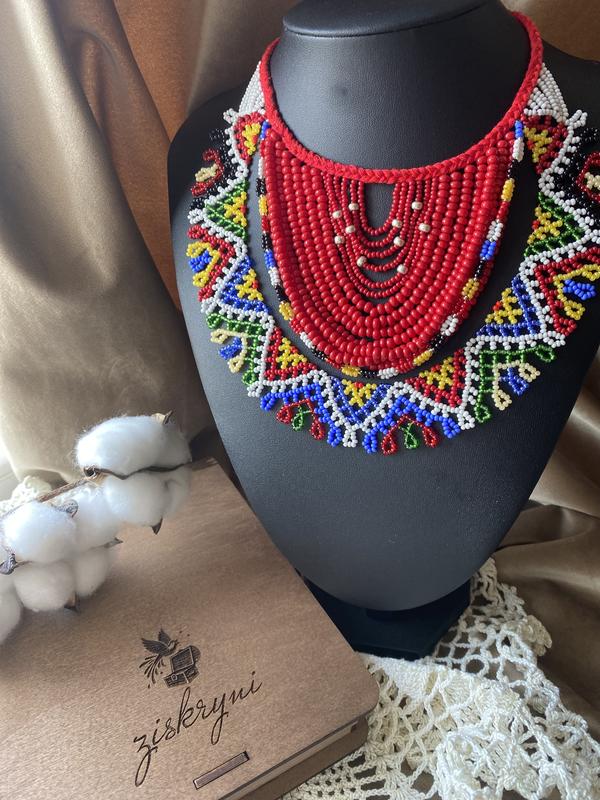 Плетінка виконана з фото стародавньої прикраси поч.ХХст. з книги О.Федорчук, але трішки перероблена по кольорах і формах. Виконана із якісного чеського бісеру вищого ґатунку, зав’язка бавовняна з кутасиками, довжина регулюється. Доповнить ваш ідеальний образ й додасть індивідуальности та ідентичности)🙌🏻✨ Прикрасу ви отримуєте в гарному пакуванні, тому можна її відразу дарувати✨😌