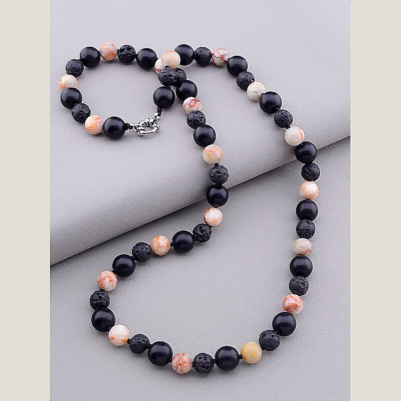 Артикул: 085863 Бренд: SUNSTONES Вес: 57,23 г. Диаметр: 8,5 мм. Длина: 59 см. Камень: Яшма(нат.) Камень2: Лава(нат.) Камень3: Шунгит(им.) Качество: Хорошее Тип замочка: Карабин Цвет: Коричневый Цвет2: Черный Цвет3: Серебряный