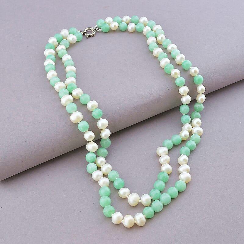 Артикул: 089499 Бренд: SUNSTONES Тип замочка: Карабин Длина: 50 см. Диаметр: 8,5 мм. Качество: А+ Камень: Амазонит(нат.) Камень2: Жемчуг(нат.) Цвет: Бирюзовый Цвет2: Белый Цвет3: Серебряный Вес: 97,28 г.