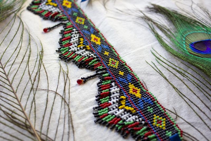 Побачивши зразок вишивки Бойківщини, подумала чому ні? Чому б не зробити щось схоже на язик? І ось він перед вами, прикрашений намистинами-крапельками Кольори, доречі, збережені - уявляєте яка це барвиста вишивана сорочка? В якості декору використані пір'їнки павича з Асканії-Нова. Їм близько 20 років Можливий повтор Орієнтовний час виготовлення до 10 днів