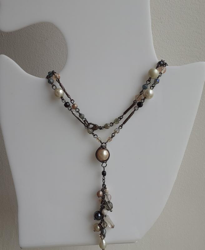 Длина 75см Бусины из стекла, на подвеске одна бусина из натурального жемчуга (белая) На бусах на некоторых бусинах под жемчуг есть незаметный сход перламутрового покрытия.