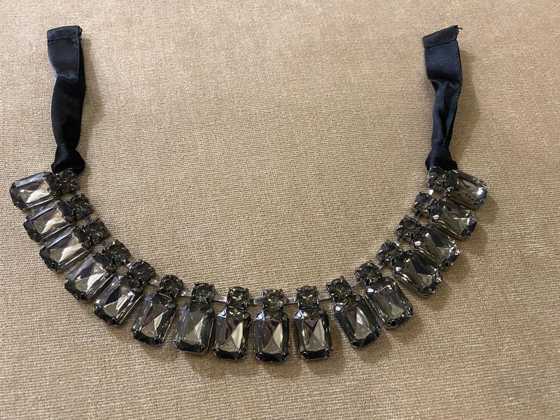 Предлагаю колье из страз дымчатого цвета в металлической оправе. По бокам колье имеет ленты с крючками, с помощью которых можно закрепить под воротничок, если там сделать петельку для крючка. Если вам будет удобнее, то можно снять ленту с крючками, продеть долбительную ленту и завязывать. Колье очень уместно к выставленному поясу, но на поясе немного более серые стразы, а в колье дымчатые. Общая длина между крючками 38 см, длина колье по стразам 21 см. Более крупные камни имеют размер 12 мм на 20 мм, меньшие квадрат 7 мм.