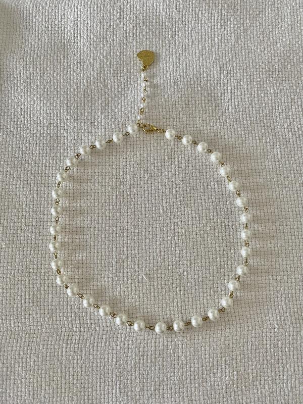 Ожерелье из искусственного жемчуга с удлинителем- подвеской сзади . Длина без удлинителя 55 см. Длина цепочки-подвески 6 см. Диаметр жемчужин 9 мм