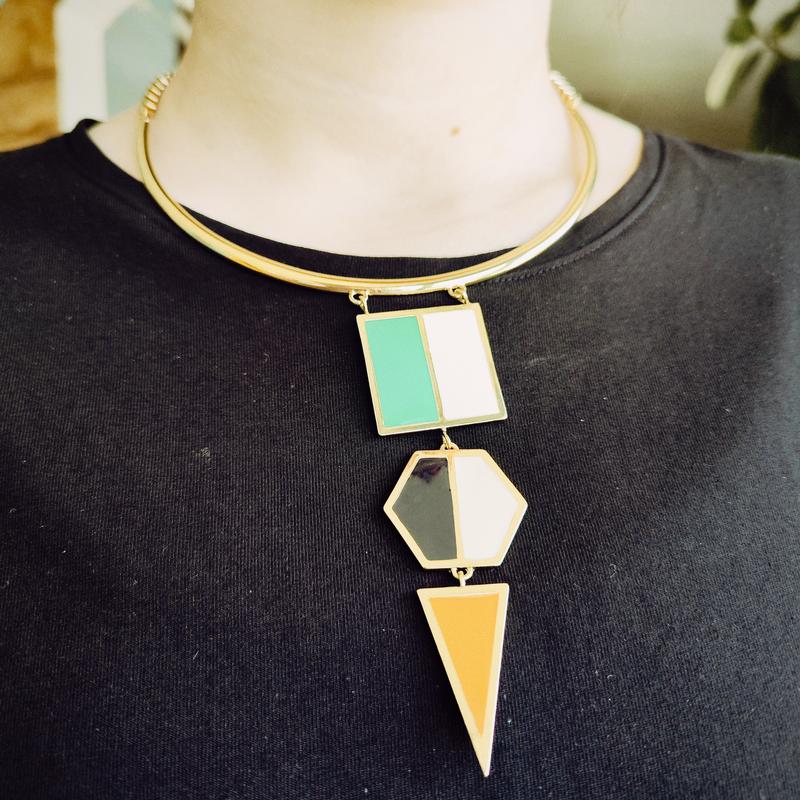 Дуже стильная прикраса британського бренду FRENCH CONNECTION. Компанія була заснована в 1972 році з метою створення модного одягу, орієнтованого на дизайн. Сьогодні бренд розробляє сучасний одяг, аксесуари та товари для дому. FRENCH CONNECTION пропонує екологічно чисті та доступні якісні вироби, які, як стверджують у компанії, витримують випробування часом, додаючи клієнтам впевненості виглядати та почуватися якнайкраще щодня. Дане кольє у прекрасному стані. Нетривіальная стильна форма - комбінація ланцюга і по центру жорсткої дуги. Золотистий сплав. Акцентна довга геометрична потрійна підвіска - квадрат, шестикутник і трикутник. Молочна, чорна, зелена і помаранчева емаль. Довжина - 48 см + 3,5 см подовжувача. Доданий відеоогляд.