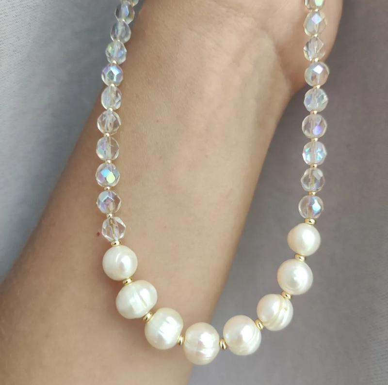 Чокер колье ожерелье из натуральных жемчуга жемчуг хрусталь речные жемчужины, хрустальные бусины, фурнитура позолота из латуни 🔥 основа ювелирный трос длина с застежкой +- 40 см + удлинитель 5 см