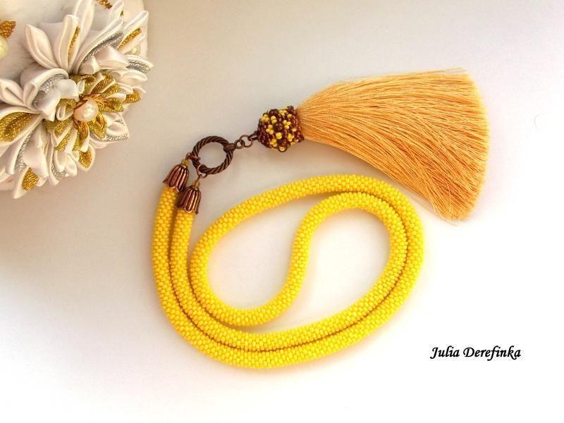 Длинный желтый сотуар с подвеской-кисточкой. Кисточка сделана из вискозных нитей и имеет вязанный колпачок из чешского бисера. Сотуар без застежки. В комплект можно заказать браслет или серьги (цену уточняйте). Общая длина 73 см, вязаная часть 60 см, длина подвески 13 см