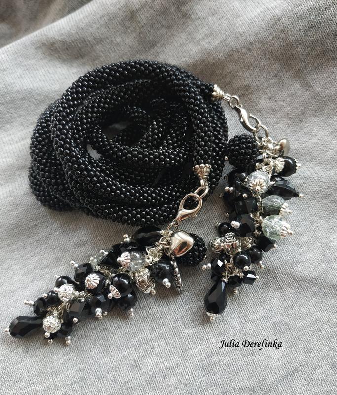 Лариат Темная ночь изготовлен из глянцевого черного бисера. Кисти съемные, длина 6-7 см. Бусины на китичках разнообразные – акрил, стекло, пластик. Фурнитура под серебро. Бисер японский Тохо. Лариат продан. Сделаю на заказ, точный повтор невозможен. Товар под заказ