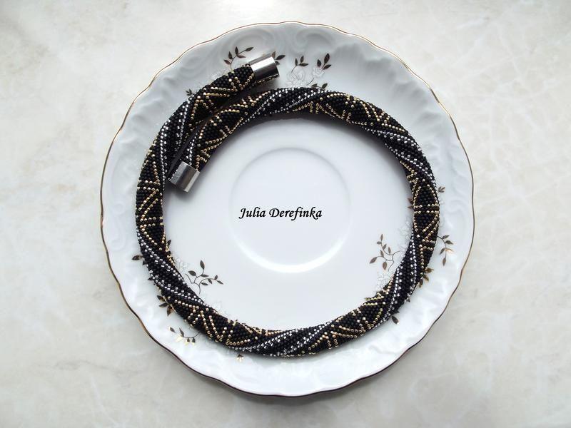 Короткое колье из мелкого японского бисера Тохо 15. Классическая украшение с геометрическим узором, серебро и золото на матовом черном. Идеально подходит к маленькому черному платью, и не только :) Магнитная застежка позволяет за считанные секунды надеть и снять украшение без посторонней помощи. Этот жгут подойдет практически к любому платью, блузке или просто кофточки. Длина 42,5 см, ширина 10 мм. Вес 32 г Товар под заказ