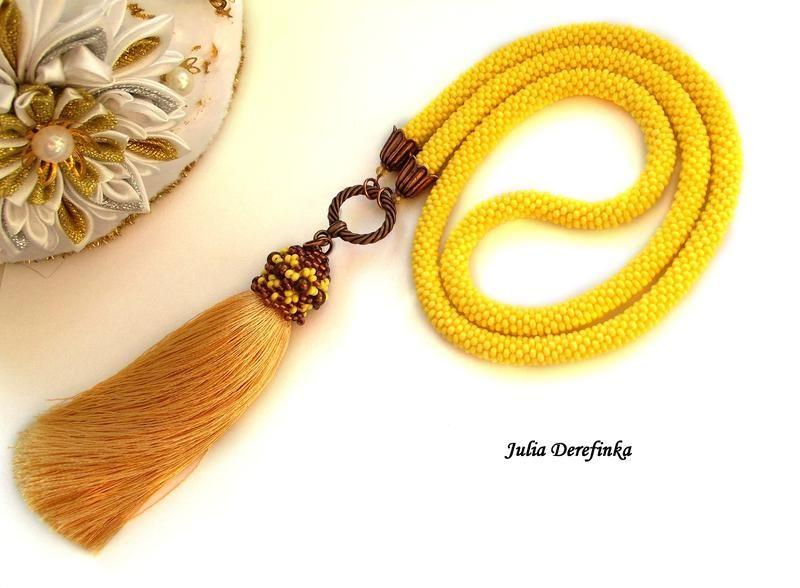 Довгий жовтий сотуар з підвіскою-китичкою. Китичка зроблена з віскозних ниток і має плетений ковпачок з чеського бісеру. Сотуар без застібки. Загальна довжина 73 см, в′язана частина 60 см, довжина підвіски 13 см