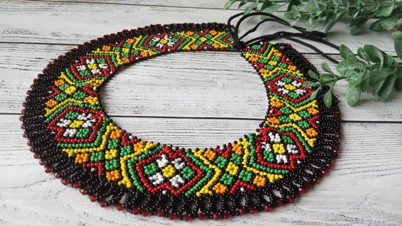 Довжина навколо шиї -37,5см. Ширина -4см. Зав"язки по-30 см, ними зручно регулювати довжину. Чеський бісер, кришталеві намистини, міцна нитка. Товар виготовляється на замовлення.